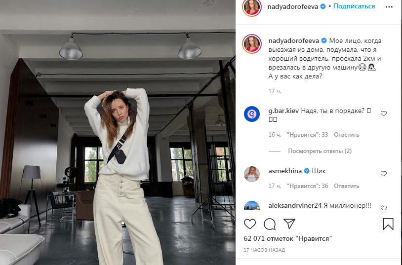 "Надя, ты в порядке?", "Шик", "Ничего. Ты тооочно 100% осчастливила водителя той машины. И вообще, главное , что ты жива здорова и красива, остальное не важно", "В этом году все не слава богу", "Будь аккуратнее", "Это все 2020!!!!! Ты хороший водитель", - написали подписчики.