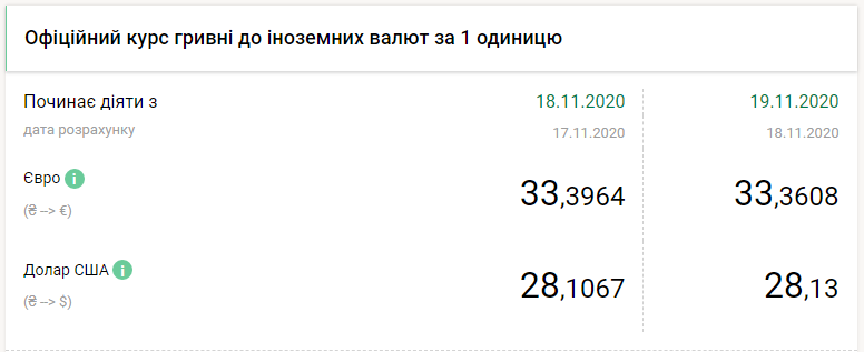 Национальный банк Украины на четверг, 19 ноября, понизил курс гривны более чем на 2 копейки по отношению к доллару, но укрепил на 3,5 копейки к евро, передает FaceNews.ua. Об этом свидетельствуют данные на сайте НБУ.