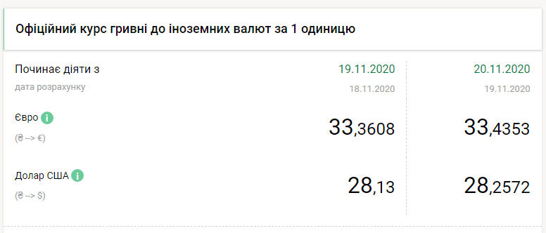 Национальный банк Украины на пятницу, 20 ноября, понизил курс гривны почти на 13 копеек по отношению к доллару и более чем на 7 копеек к евро, передает FaceNews.ua. Об этом свидетельствуют данные на сайте НБУ.