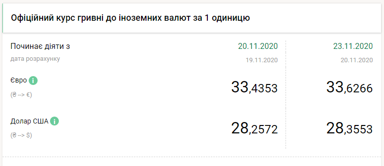 Национальный банк Украины на понедельник, 23 ноября, понизил курс гривны почти на 10 копеек по отношению к доллару и более чем на 19 копеек к евро, передает FaceNews.ua. Об этом свидетельствуют данные на сайте НБУ.