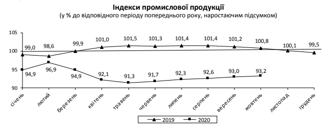 Объемы промышленного производства в октябре 2020 года по сравнению с аналогичным месяцем прошлого года сократились на 5,0%. Это больше, чем в сентябре, когда было зафиксировано падение на 4,4%, передает FaceNews.ua.