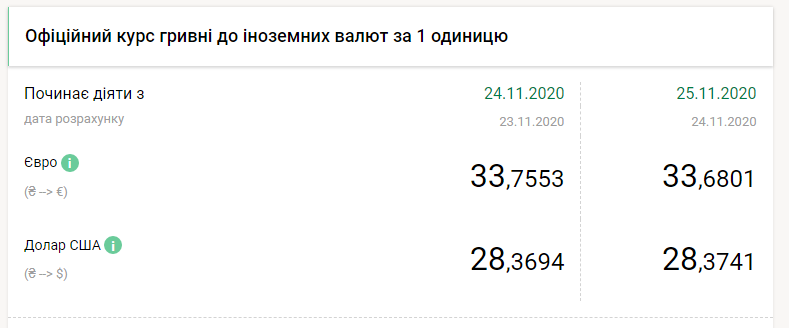 Национальный банк Украины на среду, 25 ноября, понизил курс гривны менее чемна 1 копейку и укрепил более чем на 7 копеек к евро, передает FaceNews.ua. Об этом свидетельствуют данные на сайте НБУ.