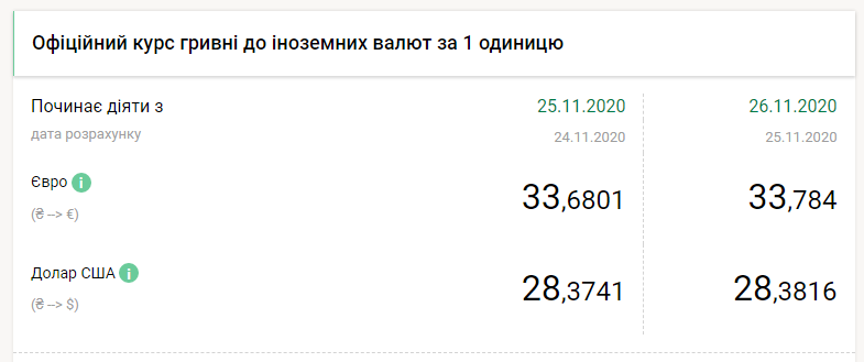 Национальный банк Украины установил на 26 ноября, курс доллара на уровне 28,38 грн, передает FaceNews.ua. Об этом сообщается на официальном сайте НБУ.