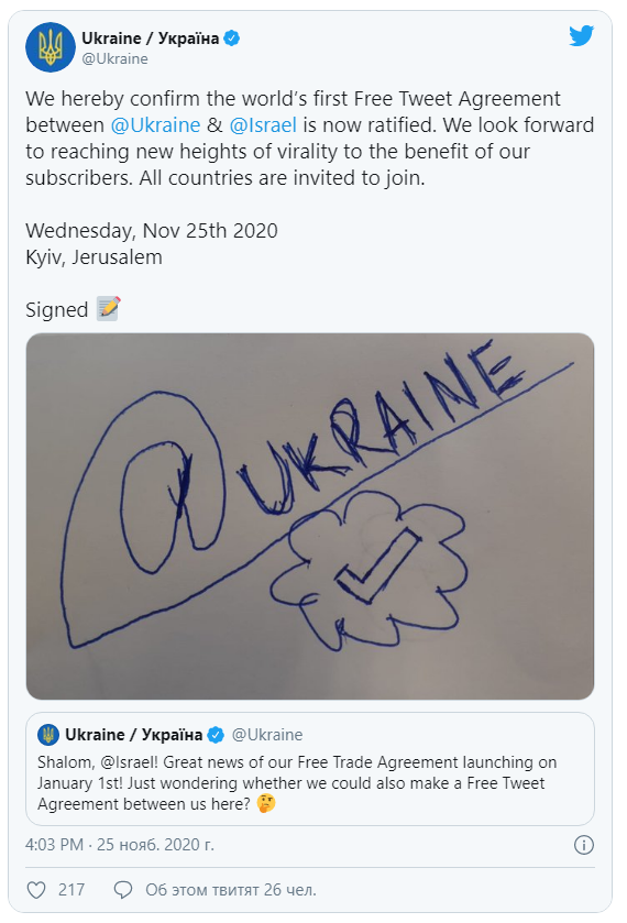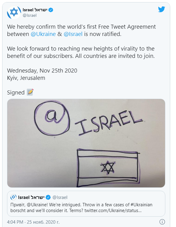 "Этим мы подтверждаем, что первое в мире Соглашение о свободных твитах между Украиной и Израилем ратифицировано. Мы с нетерпением ждем достижения новых вершин виральности на благо наших подписчиков. Приглашаются все страны", - говорится в совместном заявлении обеих аккаунтов.