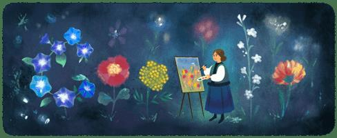 Дудл выдержан в стиле произведений художницы: на нем изображены цветы и сама Белокур с кистью в руке и мольбертом.