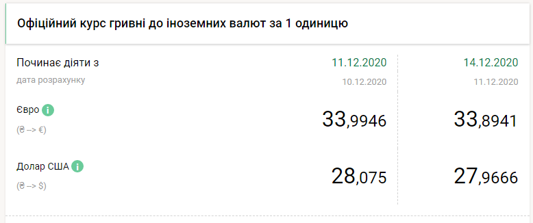 На межбанковском валютном рынке курс доллара в продаже снизился на 8 копеек до 27,97 гривен за доллар, курс в покупке до 27,95 гривен за доллар. Курс евро в продаже снизился на 19 копеек до 33,89 гривен за евро.