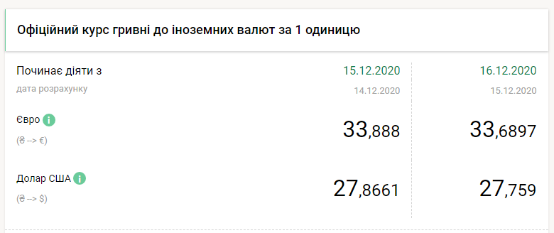 Национальный банк Украины на среду, 16 декабря, укрепил курс гривны более чем на 10 копеек по отношению к доллару и почти на 20 копеек к евро, передает FaceNews.ua. Об этом свидетельствуют данные на сайте НБУ.