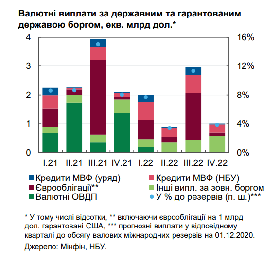 Согласно графику выплат, в 2021 году Украина должна погасить $10 млрд внешних долгов, в 2022 – $7 млрд. Пик выплат придется на третий квартал 2021 года – около $4 млрд.