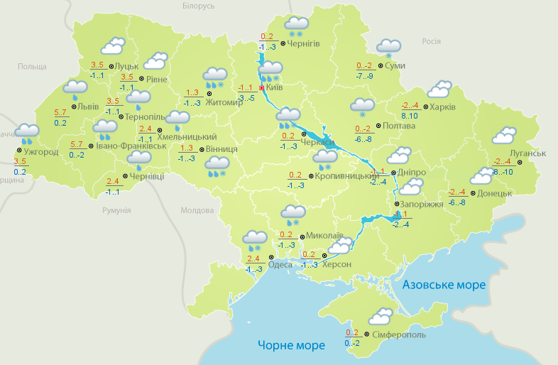 На Севере Украины возможно будет падать снег, который стихнет лишь ближе к вечеру. Воздух там прогреется до 0...+2 градуса. На Юге день будет облачным. Вечером синоптики прогнозируют снег. Там столбики термометров максимально покажут 0...+2 градуса.