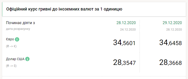 Курс гривны к мировым валютам на 29 декабря выглядит так: