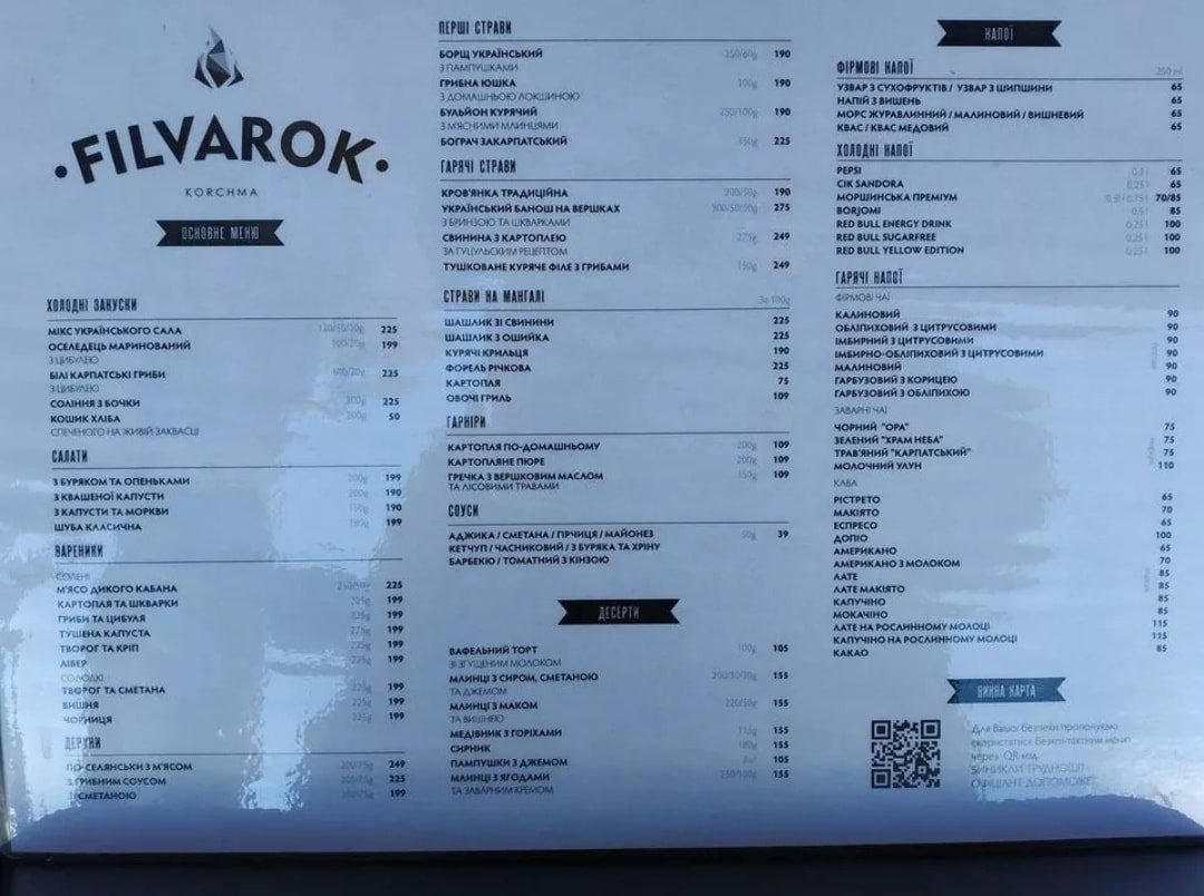 Отмечается, что меню сфотографировал в воскресенье один из посетителей корчмы Filvarok.