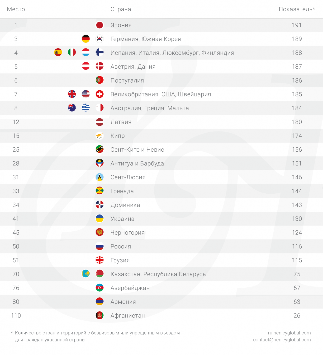 Справка: Индекс паспортов компании Henley & Partners представляет собой международный рейтинг стран по уровню свободы передвижения, которую они предоставляют своим гражданам. Индекс издается с 2006 года в сотрудничестве с Международной ассоциацией воздушного транспорта (IATA), которая поддерживает самую большую в мире базу туристической информации. Компания Henley & Partners, работающая в сфере планирования местожительства для частных клиентов и их семей, выступает в качестве советника правительств различных стран при разработке и внедрении программ гражданства или вида на жительство через инвестиции.