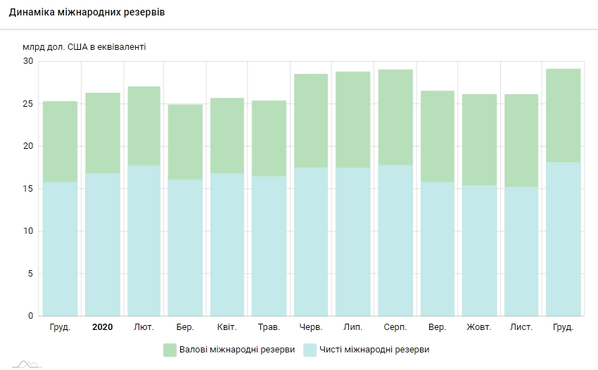 Как сообщается на сайте Национального банка Украины (НБУ), за весь 2020 год резервы выросли на 15,1% (на 3 830,47 млн долларов). На 1 января 2020 года резервы составляли 25 302,16 млн долларов.
