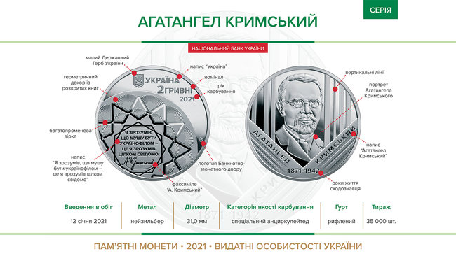 На аверсе монеты изображен малый герб Украины, геометрический декор из раскрытых книг, которые складываются в звезду, а также цитата Агатангела Крымского. На другой стороне - портрет историка, его имя и годы жизни.