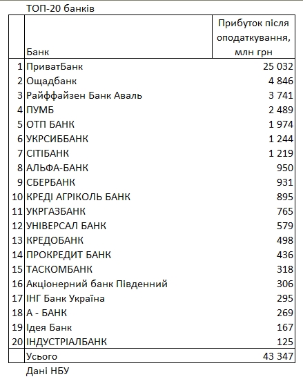 Платежеспособные банки Украины за январь-ноябрь 2020 года получили 43,347 млрд гривен прибыли после налогообложения. Рейтинг по прибыльности возглавляет государственный ПриватБанк, который заработал 25,032 млрд гривен.
