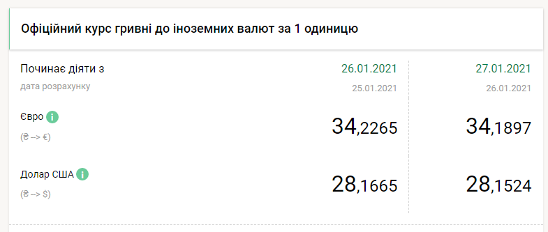 Национальный банк Украины на среду, 27 января, укрепил курс гривны почти на 1,5 копейки по отношению к доллару и укрепил почти на 4 копейки к евро, передает FaceNews.ua. Об этом свидетельствуют данные на сайте НБУ.