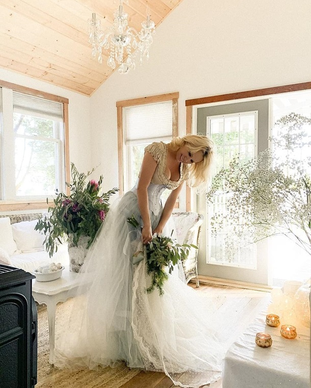 Для свадебного торжества Памела выбрала кремовый корсет от Lace Embrace, пышную нежно-голубую юбку от Joanna Delaney и длинную фату от Valentino.