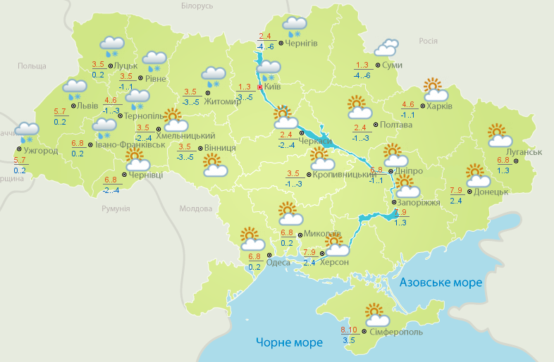 На Западной Украине утром и до самого вечера небо будет покрыто облаками. Дождь к середине дня должен прекратиться. Температура воздуха составит +5...+7 градусов. Погода в Восточной Украине будет преимущественно ясной. Однако синоптики не исключают небольшой дождь. Там прогнозируют + 6...+8 градусов.