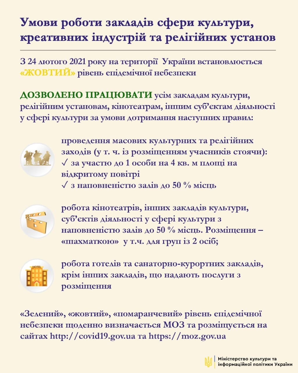Как сообщили на официальном сайте министерства культуры и информационной политик, с 24 февраля территории Украины устанавливается "желтый" уровень эпидемической опасности. С этого дня в стране будет разрешено: