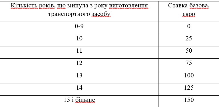 В этой формуле ставка базовая - ставка налога в евро за 1 штуку транспортного средства, которая определяется исходя из количества лет, прошедшее с года изготовления авто, до года определения ставки налога.