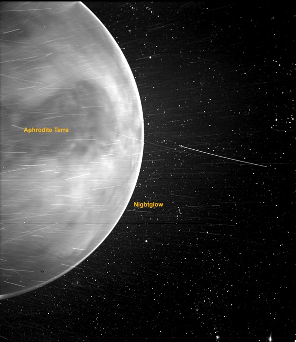 Во время полета над Венерой прибор обнаружил по краю планеты яркий обод, созданный ночным свечением - светом, излучаемым высоко в атмосфере атомами кислорода, которые на ночной стороне рекомбинируются в молекулы.