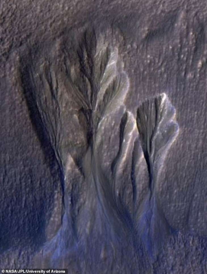 Авторы исследования этих изображений Адитья Хуллер и Филип Кристенсен обнаружили на самой низкой широте Марс свидетельство пыльного водяного льда, который превратился в овраги.