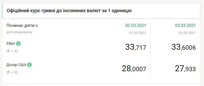 Национальный банк Украины на среду, 3 марта, укрепил курс гривны на 6 копеек относительно доллара и на 11 копеек по отношению к евро, передает FaceNews.ua. Об этом свидетельствуют данные на сайте НБУ во вторник, 2 марта.