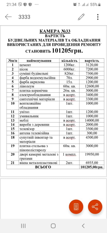 "Камера Государственного учреждения "Киевский следственный изолятор" на 20 человек: до и после ремонта. Ремонт проводился за счет средств, полученных за платные камеры в этом же следственном изоляторе. Средства налогоплательщиков не тратились. Стоимость - 101 205 грн", - написал Малюська.