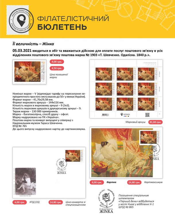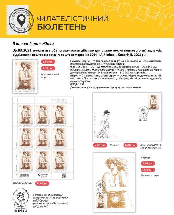 Как сообщила пресс-служба компании, первый выпуск украсят работы Тараса Шевченко Одалиска (1840 год) и украинского художника-графика Андрея Чебыкина Энергия II (1991 год). Тираж каждой марки составит 130 тысяч экземпляров. К маркам также выпущены конверты Первый день и картмаксимумы.