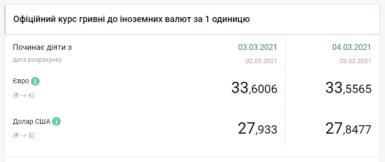 Национальный банк Украины на четверг, 4 марта, укрепил курс гривны на 8 копеек относительно доллара и на 4 копейки по отношению к евро, передает FaceNews.ua. Об этом свидетельствуют данные на сайте НБУ.