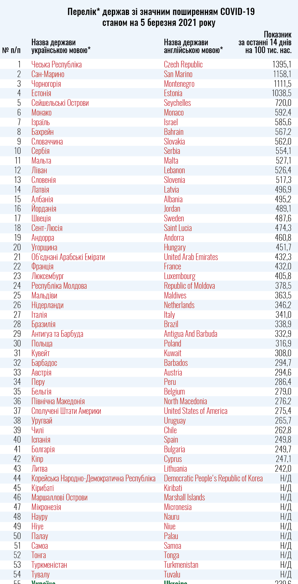 По состоянию на 5 марта Украина снова сократила список стран "красной зоны". Теперь в него входят 54 страны, неделей ранее было 61, передает FaceNews.ua.
