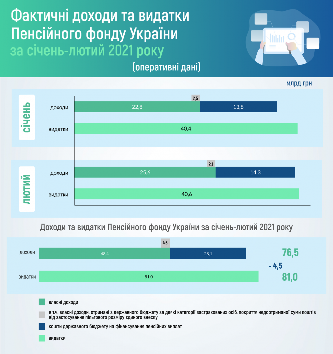 Доходы Пенсионного фонда Украины за январь-февраль 2021 года составили 76,5 млрд гривен, расходы - 81 млрд гривен, передает FaceNews.ua. Таким образом, дефицит средств фонд составил 4,5 млрд гривен.