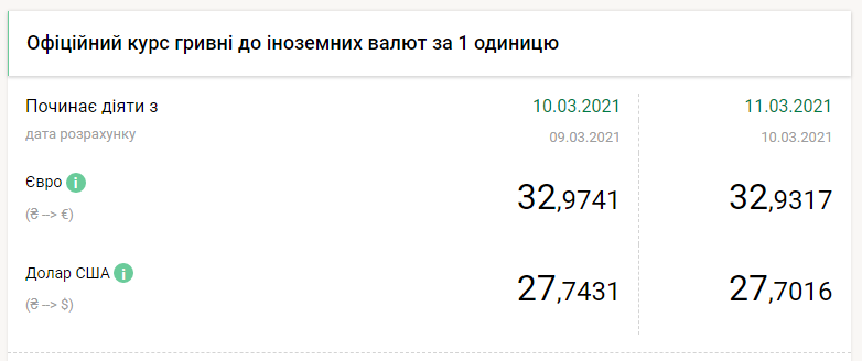 Национальный банк Украины на четверг, 11 марта, укрепил курс гривны более чем на 4 копейки по отношению к доллару и настолько же к евро, передает FaceNews.ua. Об этом свидетельствуют данные на сайте НБУ.