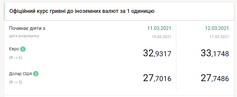Национальный банк Украины на пятницу, 12 марта, понизил курс гривны почти на 5 копеек по отношению к доллару и опустил сразу на 24 копейки к евро, передает FaceNews.ua. Об этом свидетельствуют данные на сайте НБУ.