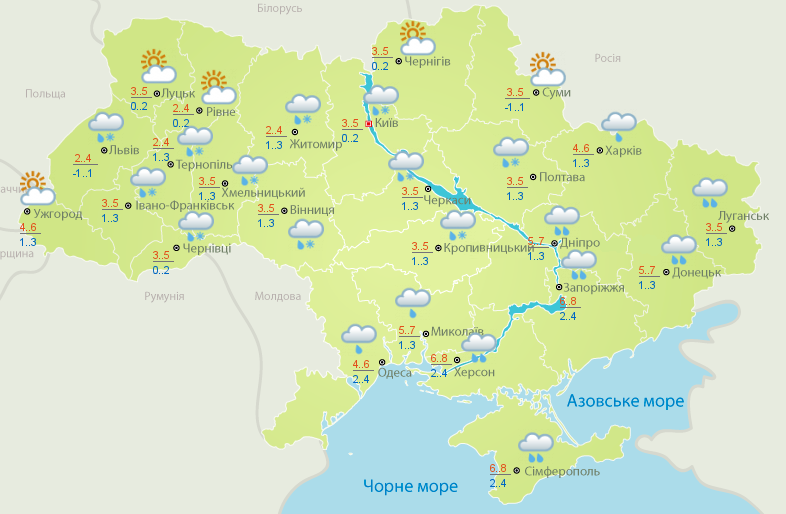 Потепления в этот четверг еще не будет. В целом температура воздуха в Украине будет колебаться в пределах +2...+6 градусов. Холоднее всего будет на западе – +2...+5 градусов. Там же синоптики прогнозируют снег.