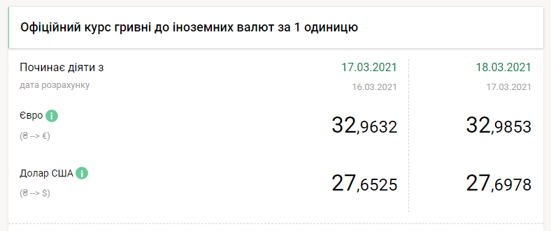 Национальный банк Украины на четверг, 18 марта, на четыре копейки опустил гривну по отношению к доллару и на 2 копейки к евро, передает FaceNews.ua. Об этом свидетельствуют данные на сайте НБУ.
