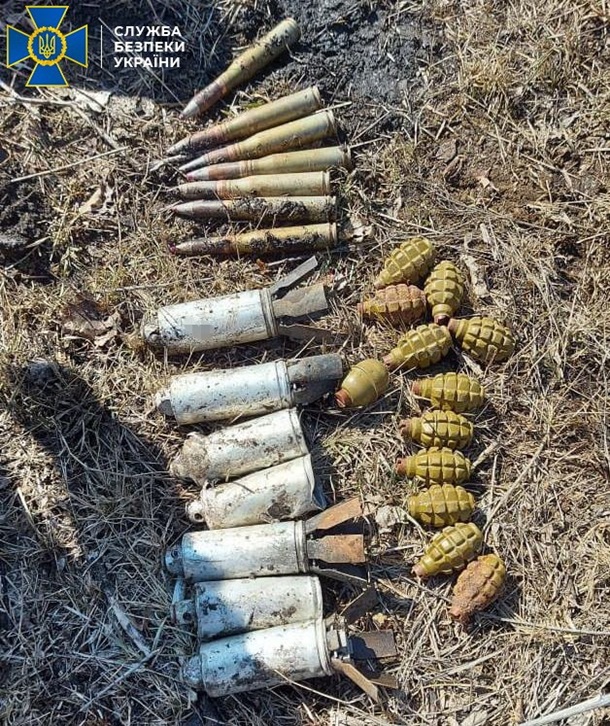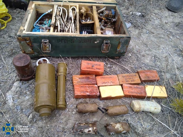 Как сообщает пресс-центр СБУ, в тайниках находились боевые элементы реактивной системы залпового огня Смерч и более 30 кг взрывчатых веществ.