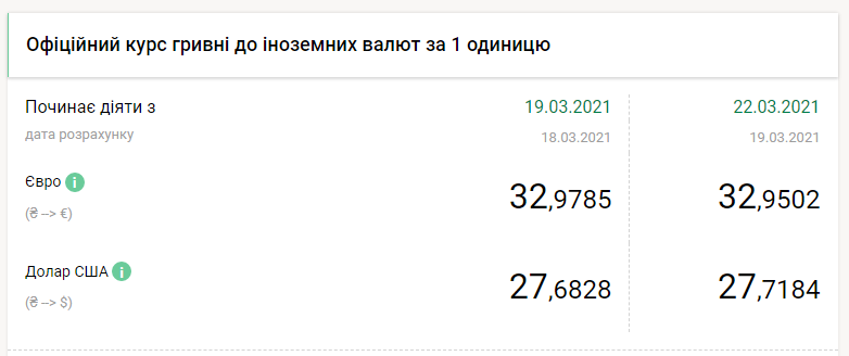 Национальный банк Украины на понедельник, 22 марта, ослабил гривну по отношению к доллару на 3 копейки и укрепил по отношению к евро на 2 копейки, передает FaceNews.ua. Об этом свидетельствуют данные на сайте НБУ.