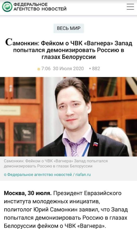 Примечательно, что именно РИА ФАН стало первоисточником множества новостей, посвящённых так называемой "вагнеровской операции". На станицах этого агентства, устами представителей власти РФ (среди которых, в частности, спикер МИД РФ, посол РФ в Белоруссии, депутаты Госдумы и различные российские политологи), распространялась информация о том, что "вагнергейт" это - провокация запада против России и "провал украинских спецслужб". Именно эту версию событий впоследствии подхватили и ряд украинских журналистов.