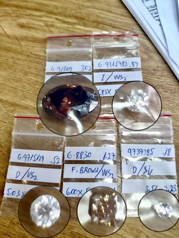 Как определили эксперты, обнаруженные камни - драгоценные камни первого порядка: алмазы ограненные (бриллианты) общей стоимостью 295 тыс. гривен (10,7 тысячи долларов США). Самый крупный из них - фантазийного насыщенного коричневого цвета камень массой 3,02 карата размером 10,58х7,68мм в огранке Овал-57. Стоимость этого камня - 5,5 тысячи долларов США. Остальные камни - в бриллиантовой огранке и огранке Радиант-57. На четырех бриллиантах обнаружены обозначения, нанесенные лазерной гравировкой, заметные только под микроскопом.