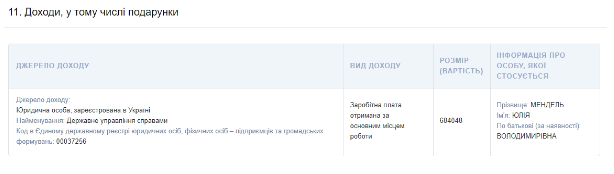 За 2020 год Мендель получила 684 048 гривен зарплаты на должности пресс-секретаря президента (без вычета налогов). В то же время Зеленский получил за этот же период 336 тысяч гривен зарплаты.