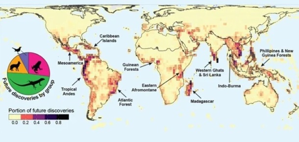 Исследователи предполагают, что наибольшее количество неизвестных видов животных обитает в Индонезии, Бразилии, Колумбии и на Мадагаскаре. Кроме этого, около половины неизвестных человечеству живых существ, предположительно, находится в тропических широколиственных лесах.