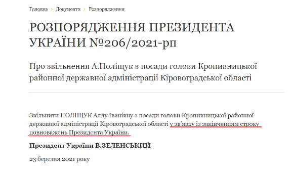 В Telegram-канале Офиса президента сообщается: «Распоряжением президента Украины от 23 марта 2021 № 206/2021-рп от должности председателя Кропивницкой районной государственной администрации Кировоградской области освобождена Алла Полищук, которая была назначена на указанную должность 6 марта 2015 года распоряжением № 238 предыдущего президента Украины (в „связи с истечением срока его полномочий“)».