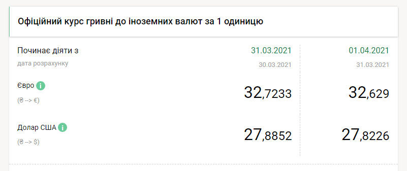 Национальный банк Украины на четверг, 1 апреля, на 6 копеек укрепил гривну по отношению к доллару и на 9 копеек по отношению к евро, передает FaceNews.ua. Об этом свидетельствуют данные на сайте НБУ.