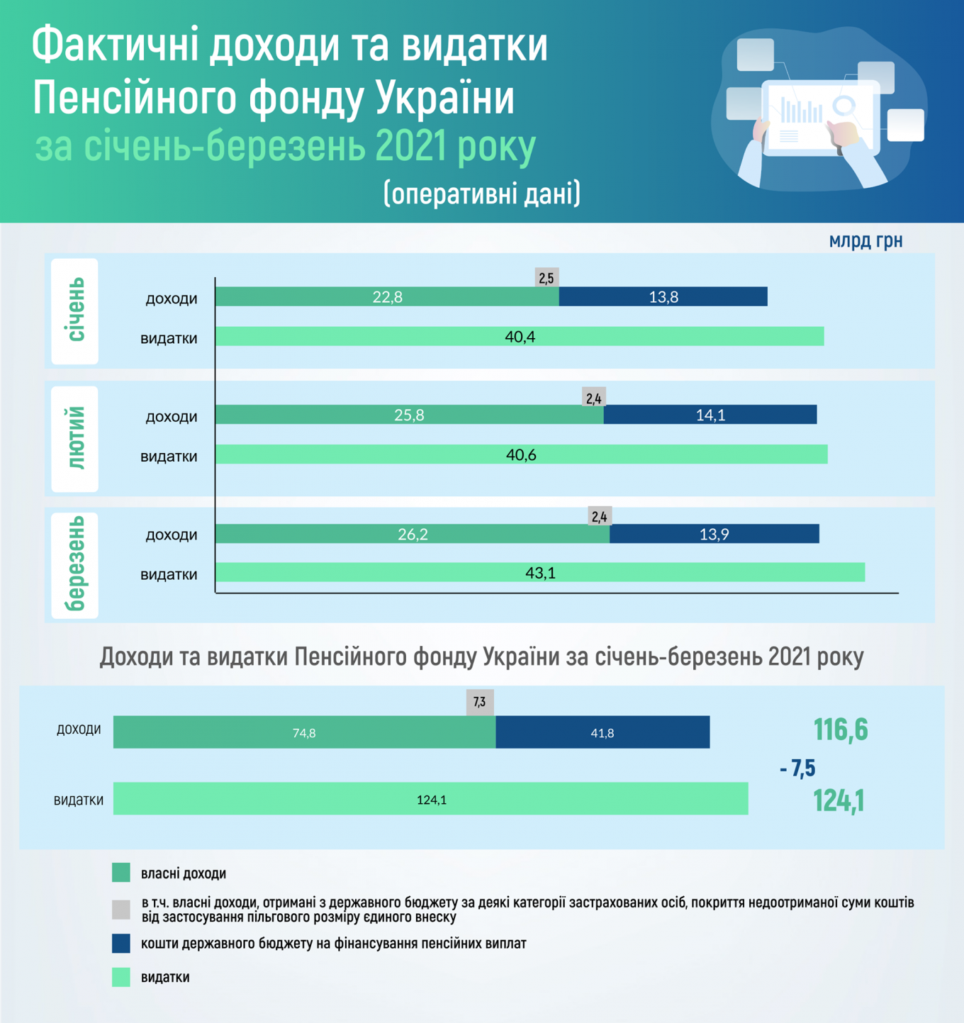 Доходы Пенсионного фонда Украины за январь-март 2021 года составили 116,6 млрд гривен, расходы - 124,1 млрд гривен. Таким образом, дефицит средств фонда достиг 7,5 млрд гривен, передает FaceNews.ua.