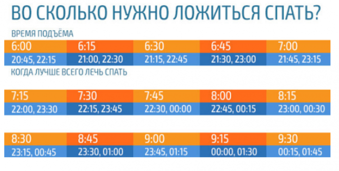 Мы засыпаем ориентировочно за 15 минут, а это значит, если нужно проснуться в шесть, то следует ложиться в 20:45 или 22:15.