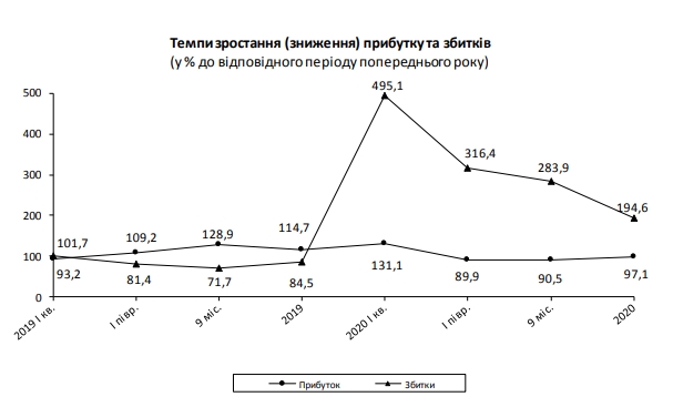 По данным статистического ведомства, прибыль предприятий составила 602,3 млрд гривен, что на 2,9% меньше по сравнению с 2019 годом, однако допущено убытков на сумму 337,9 млрд грн, что на 94,6% больше по сравнению с 2019 годом.