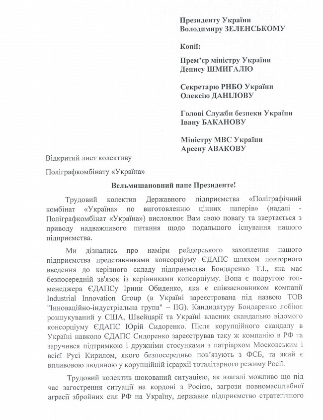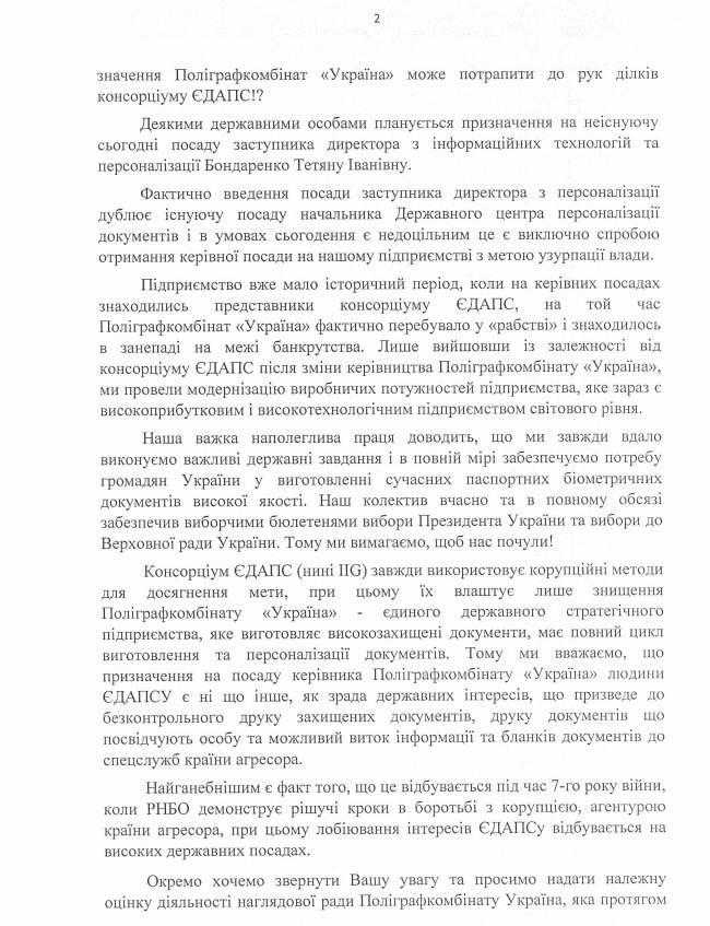 Как говорится в открытом письме, некоторые государственные лица планируют назначить на несуществующую сегодня должность заместителя директора по информационным технологиям и персонализации Татьяну Бондаренко, которая имеет непосредственную связь с руководителями консорциума. Получение руководящей должности, отмечают работники полиграфкомбината «Украина», позволит ЕДАПСу узурпировать власть на стратегическом государственном предприятии. Они напоминают, что в период, когда на руководящих должностях были представители консорциума, сама «Украина» фактически находилась в «рабстве» и в упадке на грани банкротства.