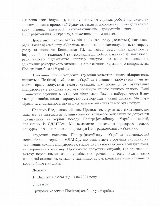 Люди просят поддержки у главы государства, чтобы состоялся прозрачный честный конкурс на занятие должности директора полиграфкомбината «Украина». В случае возврата ЕДАПС, отмечают они, производство будет сворачиваться, доходы ГП «Украина» будут уменьшаться, соответственно как и уплата налогов от деятельности, а коллектив будут сокращать.