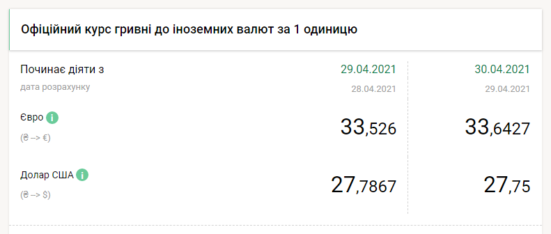 Национальный банк Украины на пятницу, 30 апреля, установил официальный курс отечественной валюты к доллару на уровне 27,75 гривен за доллар, передает FaceNews.ua. Об этом свидетельствуют данные на сайте регулятора.